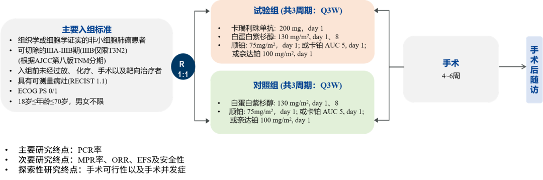 TD-FOREKNOW是一项随机对照、开放标签、Ⅱ期临床研究(NCT04338620), 纳入新诊断的、经病理确诊的ⅢA/ⅢB(T3N2)期NSCLC患者,按照1:1随机接受卡瑞利珠单抗联合白蛋白紫杉醇和铂类、或白蛋白紫杉醇和铂类治疗, 每三周为一个周期, 共3周期,在末次治疗4~6周后进行手术。主要研究终点为pCR率,次要研究终点为主要病理缓解(MPR)率、客观缓解率(ORR)、无事件生存期(EFS) 以及安全性。探索性研究终点为手术可行性以及并发症。