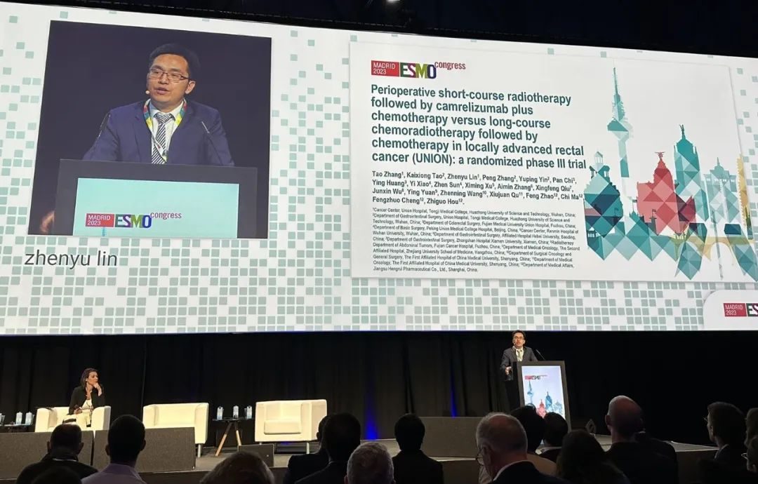 10月21日,JJB竞技宝医药创新药卡瑞利珠单抗的一项研究“新辅助短程放疗序贯卡瑞利珠单抗联合化疗对比长程放化疗序贯化疗治疗局部晚期直肠癌”随机对照Ⅲ期试验(UNION)亮相2023 ESMO大会优选口头报告现场。该研究由华中科技大学同济医学院附属协和医院张涛教授、陶凯雄教授担任主要研究者,华中科技大学同济医学院附属协和医院林振宇教授在大会现场报告了该重磅研究的结果1。此项研究是全球首个评估短程放疗序贯免疫治疗联合化疗治疗局部晚期直肠癌的Ⅲ期研究,已达到主要终点病理完全缓解(pCR),有望为直肠癌患者的治疗提供新策略。