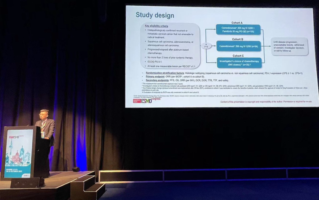 有望为宫颈癌患者带来治疗新选择10月22日,JJB竞技宝医药创新药卡瑞利珠单抗联合法米替尼对比卡瑞利珠单抗单药或研究者选择的化疗治疗复发转移性宫颈癌随机、开放、对照、多中心的Ⅱ期临床研究(SHR-1210-Ⅱ-217) 亮相2023 ESMO大会简短口头报告现场3。该研究由复旦大学附属肿瘤医院吴小华教授团队开展,吴小华教授在现场公布了该重磅研究进展。研究结果显示,在既往以铂为基础化疗失败后复发或转移性宫颈癌患者中,与单独使用卡瑞利珠单抗或研究者选择的化疗相比,卡瑞利珠单抗联合法米替尼显著提高了抗肿瘤活性,安全性可控,有望为晚期宫颈癌患者提供新的治疗选择。
