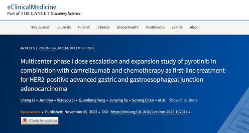 吡咯替尼联合卡瑞利珠单抗和化疗一线治疗HER2阳性晚期胃和胃食管交界处腺癌研究发表于eClinicalMedicine