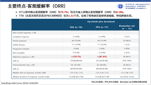 PANDORA研究是一项全国多中心、单臂试验,采用Simon两阶段设计,从2019年06月至2021年06月,在全国10家中心入组了79例HER2阳性MBC患者,接受吡咯替尼400 mg/d+多西他赛75mg/m2治疗。主要终点为客观缓解率(ORR),次要终点包括PFS、缓解持续时间(DoR)、临床获益率(CBR)和安全性等。此外,研究采用561个基因的测序组进行生物标志物分析,以探索与疗效的相关性。