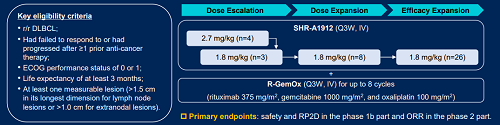 该研究包括剂量递增和剂量扩展Ib期阶段以及疗效拓展II期阶段。复发难治队列纳入既往接受过≥1线治疗的DLBCL患者,要求基线ECOG 体能状态评分为0-1,并具有可测量的病灶。患者接受SHR-A1912联合R-GemOx方案(每3周一次,静脉给药)至多8个周期后,接受SHR-A1912单药维持治疗。Ib期阶段的主要终点为安全性和II期研究推荐剂量(RP2D),II期阶段的主要终点为客观缓解率(ORR)。
