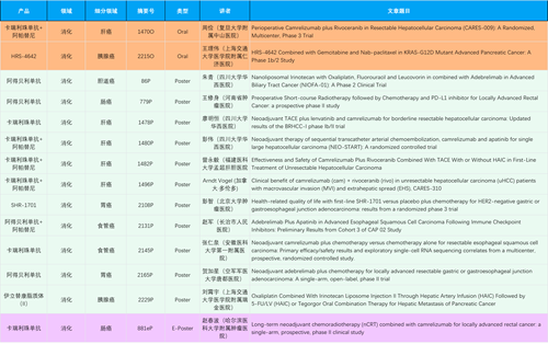在消化系统肿瘤领域,JJB竞技宝产品相关研究共入选2项口头报告、11项壁报和1项电子壁报,共14项研究。除卡瑞利珠单抗和阿帕替尼外,还有4篇阿得贝利单抗治疗消化系统肿瘤研究入选。HRS-4642、瑞拉芙普-α注射液(SHR-1701)等在研创新产品也有相应研究亮相。另有1项伊立替康脂质体(II)用于胰腺癌治疗的研究入选壁报。